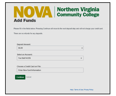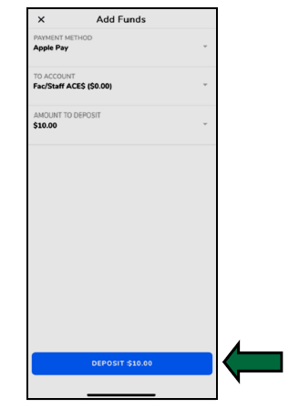 - Select the Payment Method, Account, and Amount to Deposit. Payment Method Options are AMEX, Visa, MasterCard and ApplePay (No Discover)