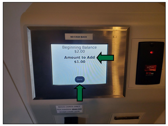 As you deposit bills, the ‘Amount to Add’ screen will update showing the total deposited so far When you are done depositing bills, press the ‘Done’ button on the screen