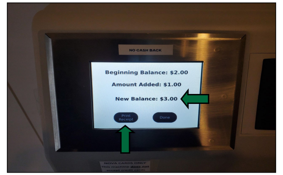 After clicking done you will be shown your ‘New Balance’ on your NOVACard account If you would like a receipt press the ‘Print Receipt’ button on the screen Press the ‘Done’ button and complete your transaction