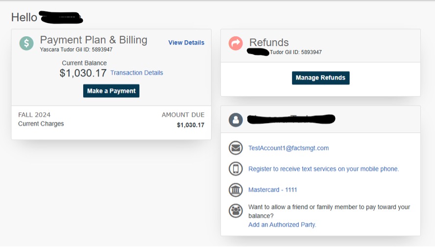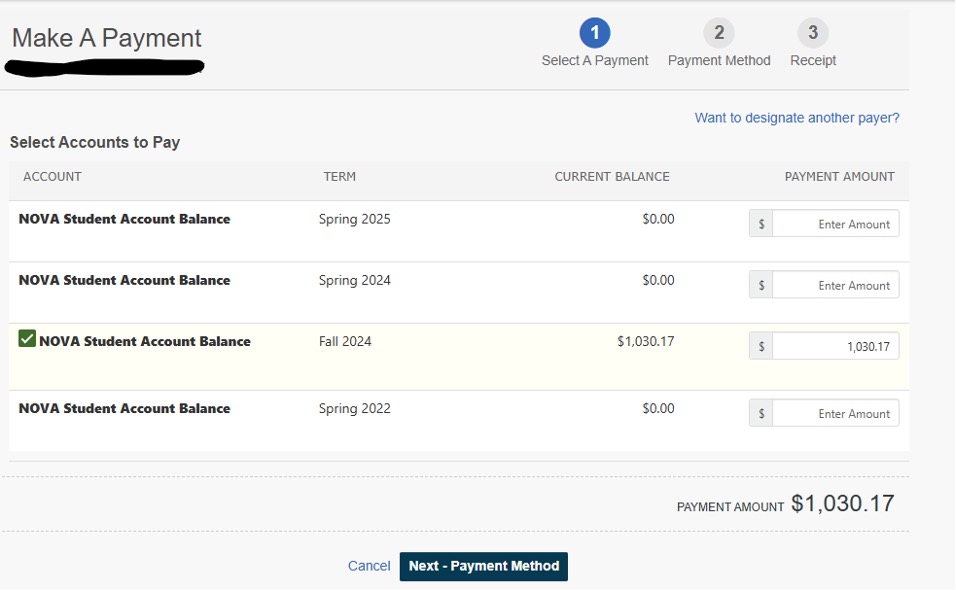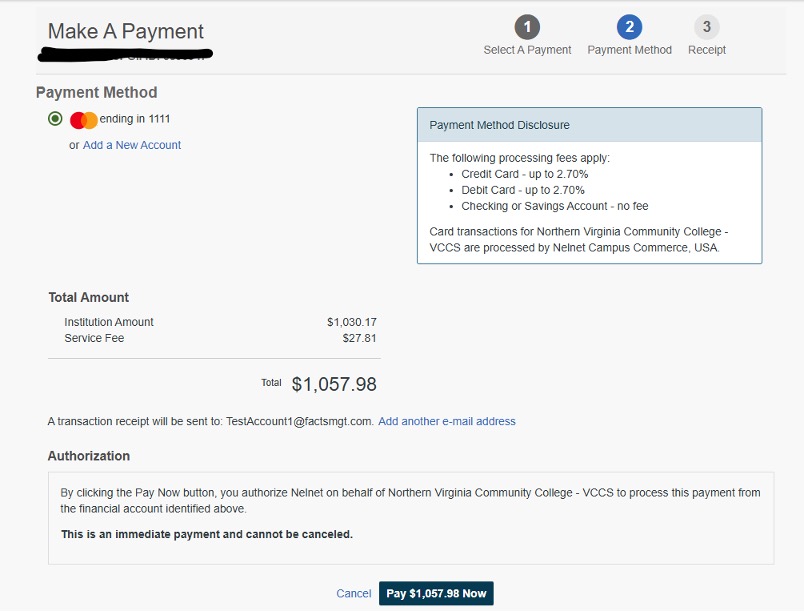 Now you will either choose an existing payment method account on file or add a new payment method account type (i.e. e-check or credit card). Note: processing fees apply only to credit/debit card transactions.